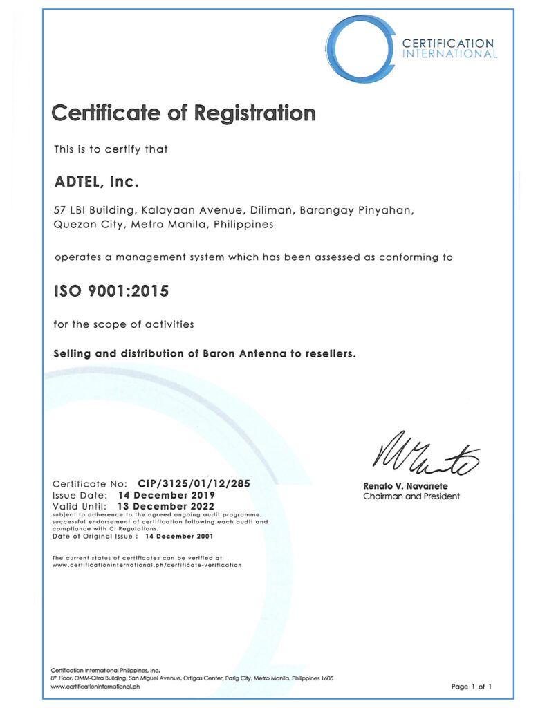 Adtel receives its ISO 9001:2001 certification in the areas of telephone supply and subscriber line installation from Certification International in December.